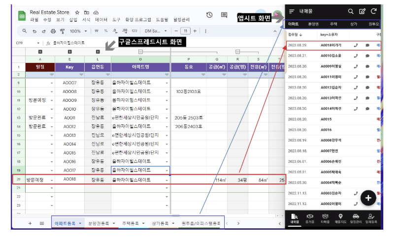 좀 더 이해하기 쉽게 설명드리면 구글 스프레드시트에 있는 부동산 매물장을 핸드폰에서 앱의 형태로 볼 수 있게 해 주는 것이 앱시트입니다. 구글 스프레드시트에서 정보를 입력하거나 앱시트에서 정보를 입력하면 연동이 되기 때문에 매물 정보를 수첩, 메모장 이런 곳에 여러 번 적을 필요 없이 단 한 번만 입력하면 됩니다.